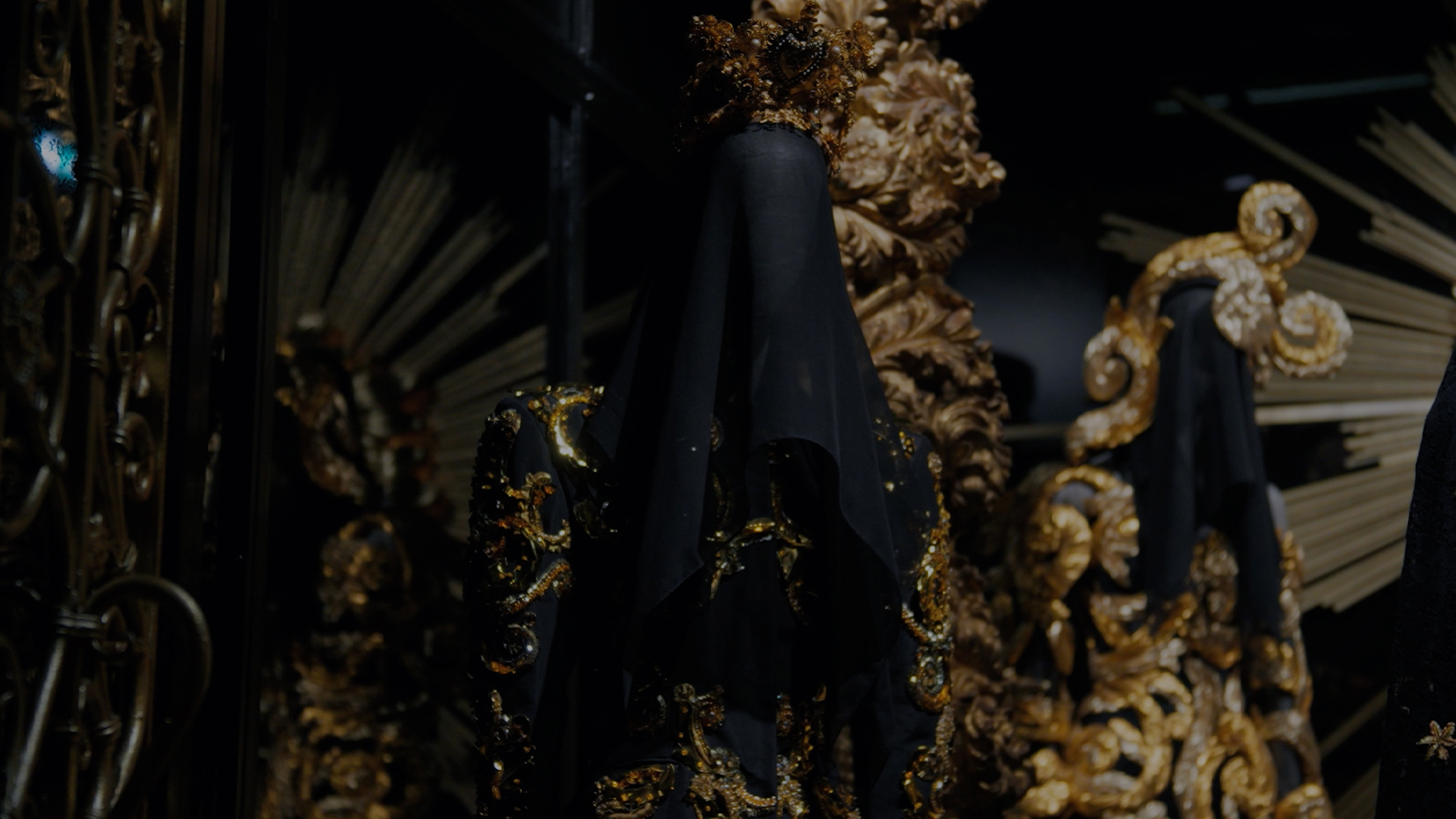 A tribute to the Sacred Heart, a symbol of life, love, and the essence of the exhibition, it serves as a central and magnificent element for those who create beauty with their hands. Its splendour commands attention and characterises an installation that immerses visitors in a near-mystical atmosphere. The clothes on display are infused with sumptuous virtuosity inspired by the baroque theatrical art of the seventeenth century.