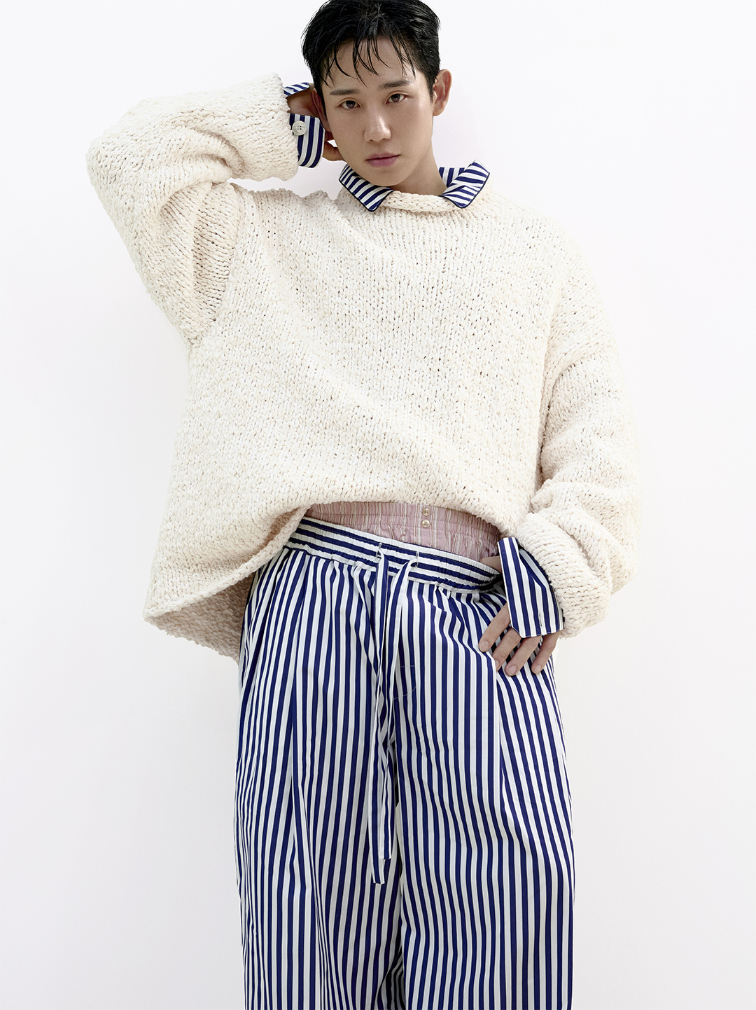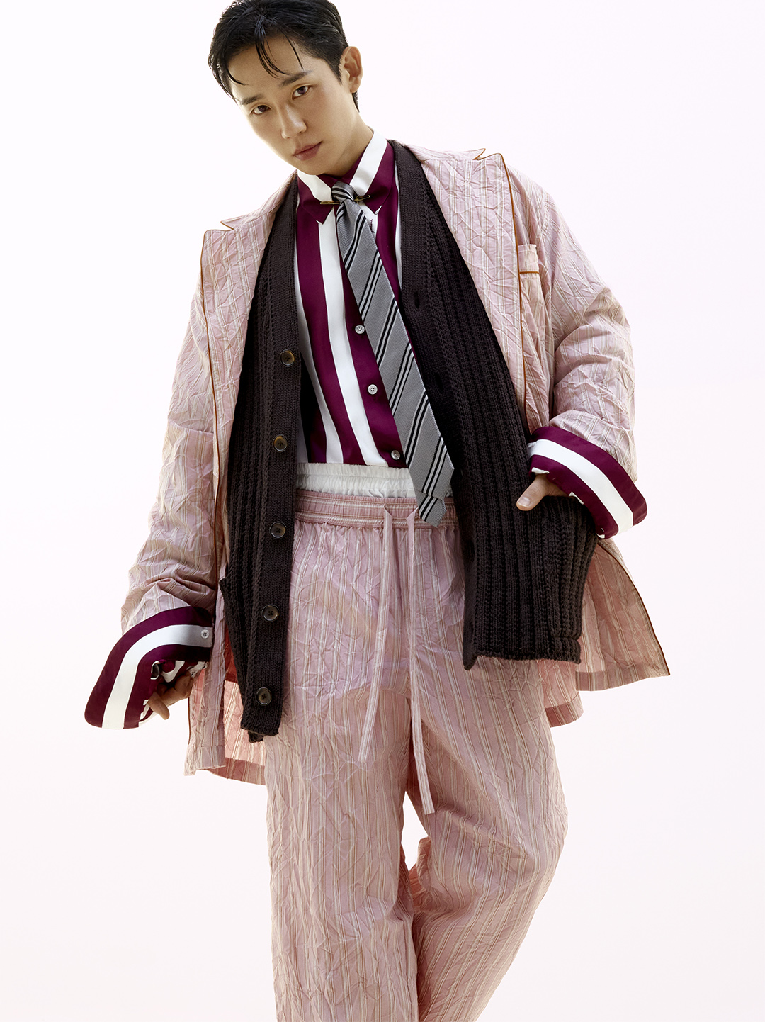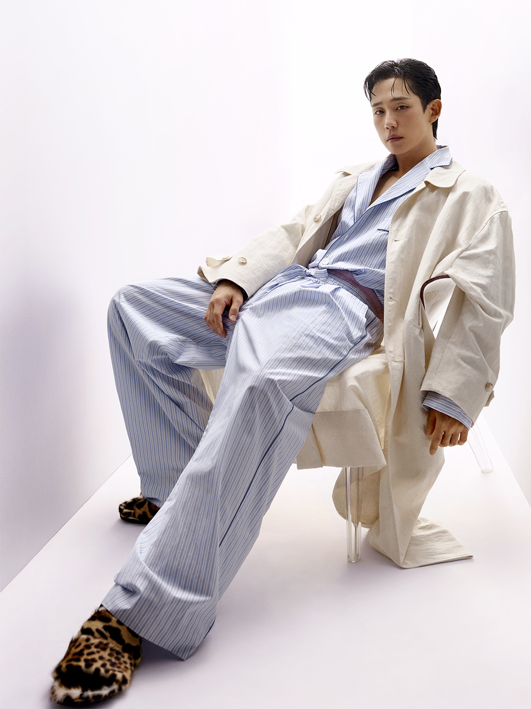Jung Haein poses immersed in a play of reflections and chiaroscuro that highlights his charisma. Summer meets and blends into an essential Italian aesthetic, where the pyjama takes center stage and steps out of the bedroom, blurring the lines between indoor and outdoor, and offering a personal and authentic approach to style.