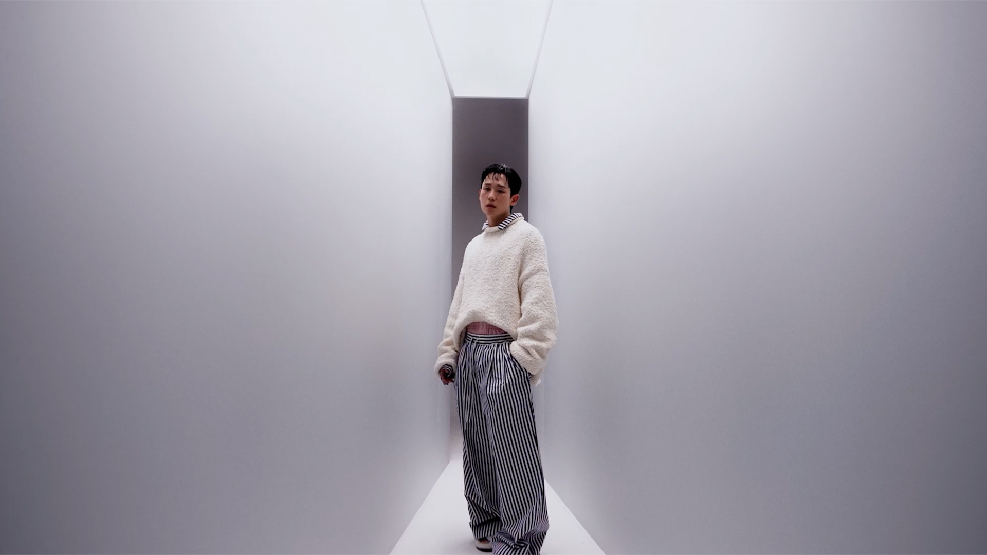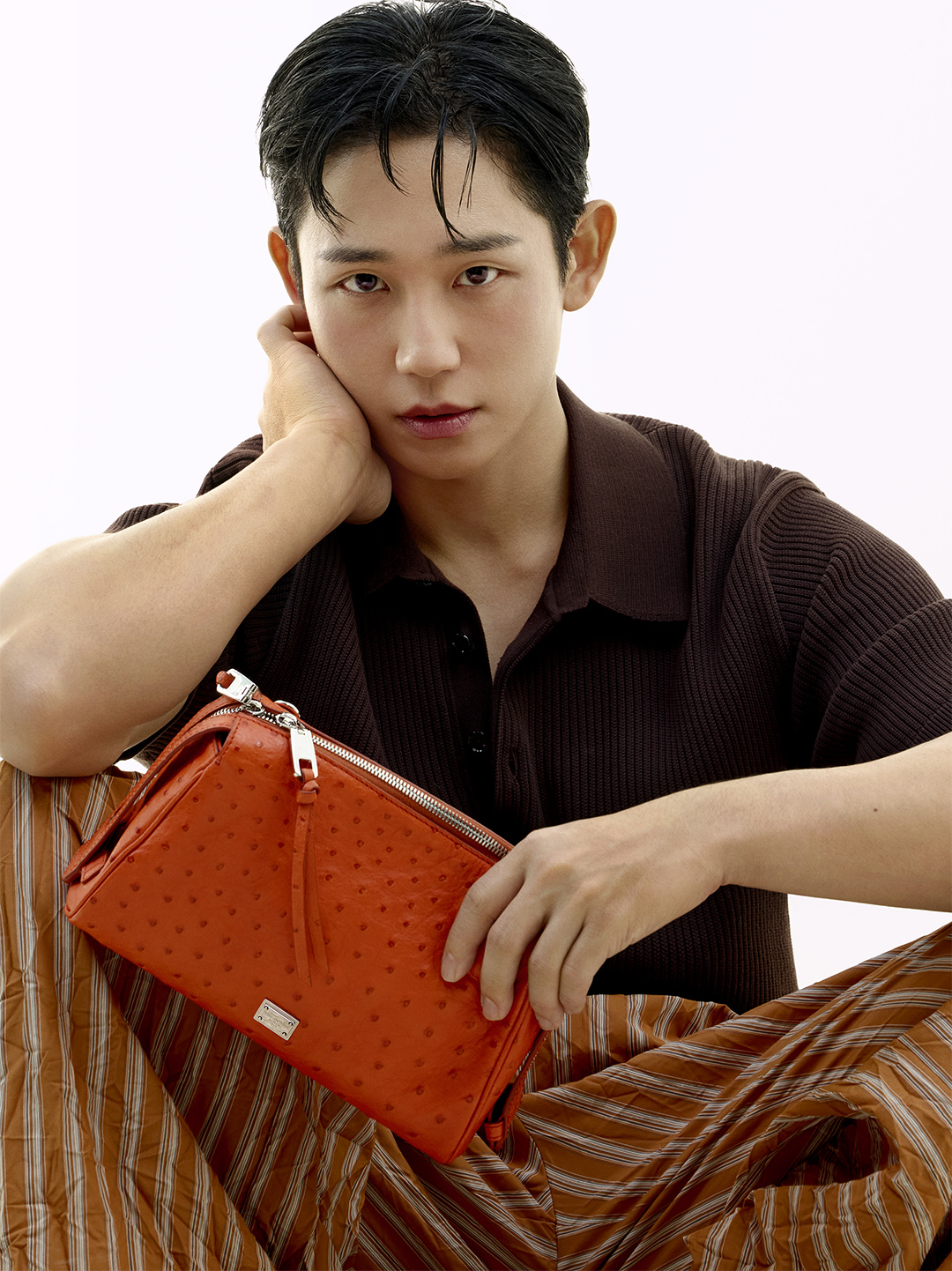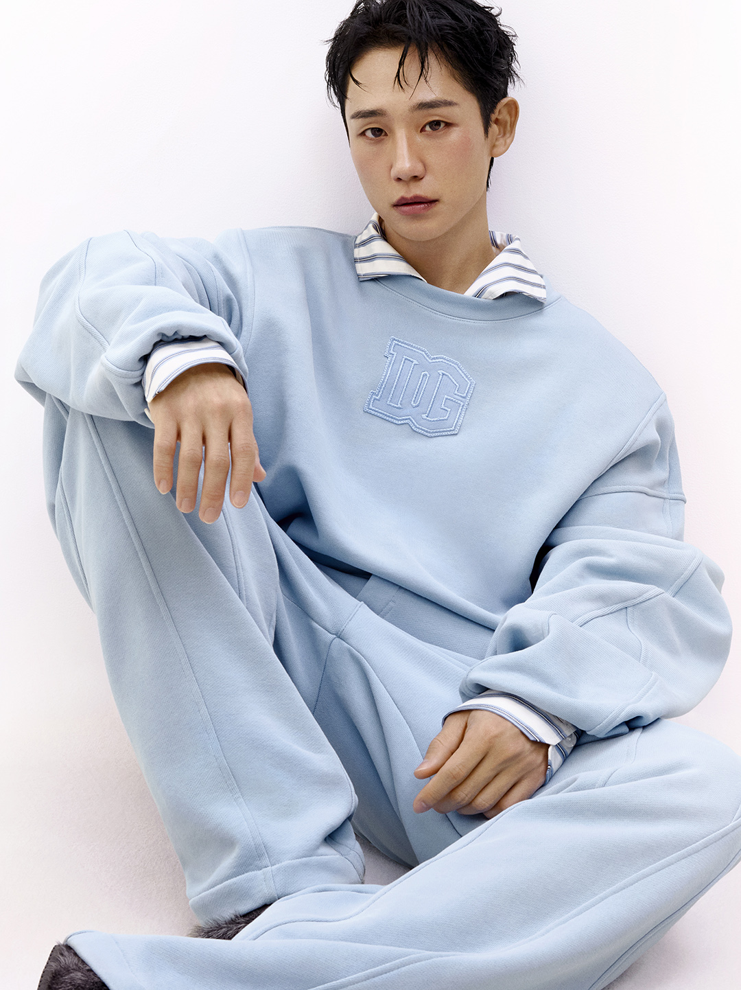 Jung Haein poses immersed in a play of reflections and chiaroscuro that highlights his charisma. Summer meets and blends into an essential Italian aesthetic, where the pyjama takes center stage and steps out of the bedroom, blurring the lines between indoor and outdoor, and offering a personal and authentic approach to style.