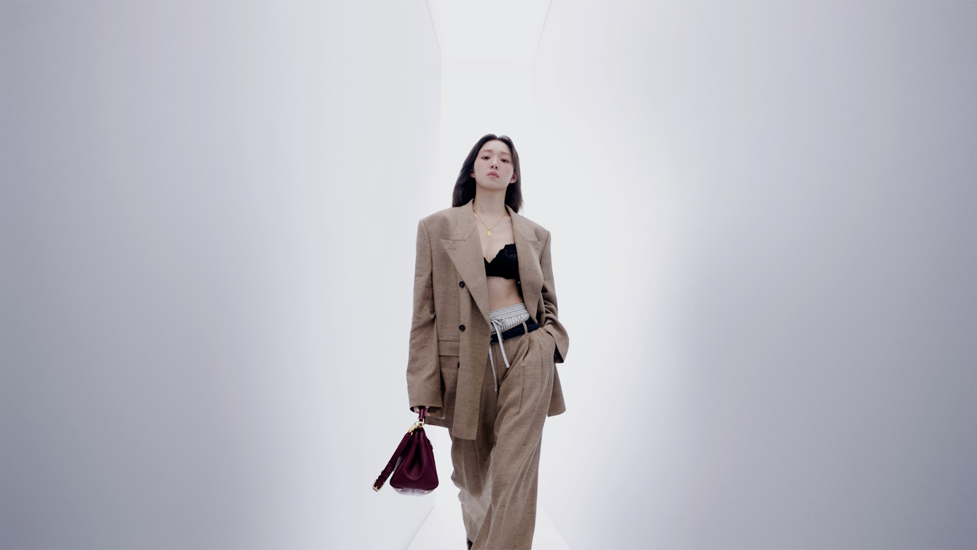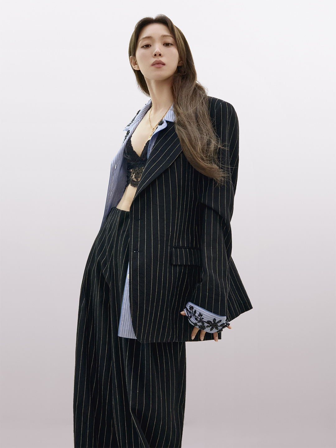 Lee Sung Kyung expresses her romantic nature and sensual charm with a relaxed attitude and a touch of irreverence. Playing with the pieces of her wardrobe, she naturally manifests her identity. Femininity merges with masculine codes, day dissolves into night, and the everyday is elevated into the unexpected, shaping a bold, distinctive universe where possibility knows no bounds.